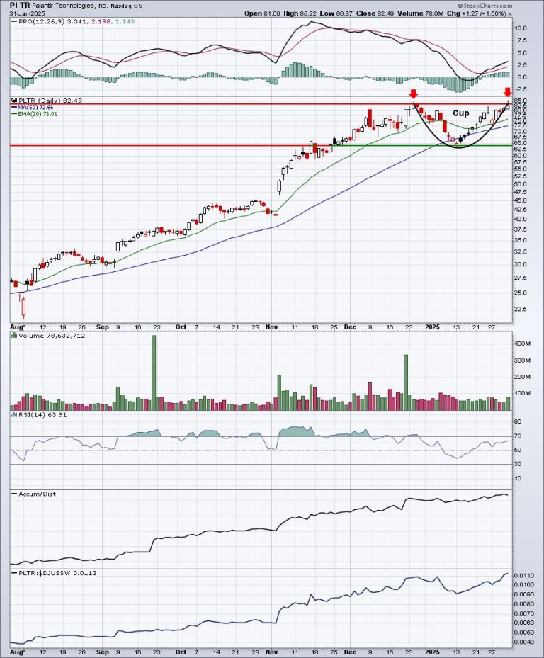 First, let me say that PLTR has a very strong chart. The AD line is continuously rising, a bullish cup has formed, and PLTR is a leader amongst software stocks ($DJUSSW). Second, I’m not saying PLTR is a short candidate. I’m simply saying it would be a sell for me short-term to take profits. I rarely short during secular bull markets. If it does make the breakout, I can always decide to jump back in. But I’d be looking for PLTR to pull back to form a handle off the cup pattern, or possibly even pull back to the recent low near 65. Sideways consolidation is a very real possibility after an extended advance like the one PLTR has enjoyed. If you need further evidence, look no further than NVIDIA Corp (NVDA) after its June/November/January tops. It’s still consolidating.