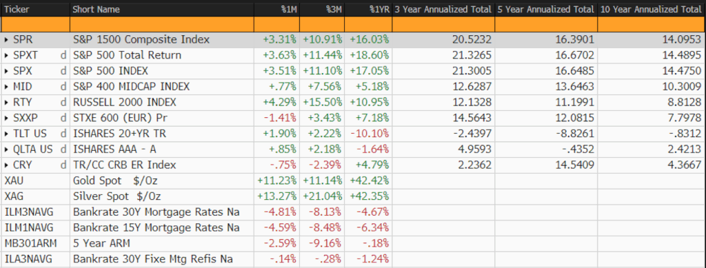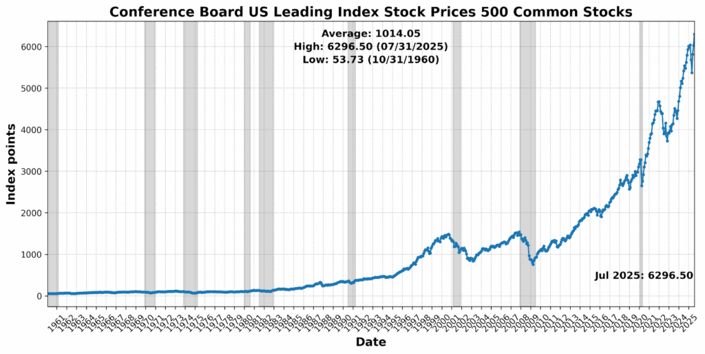 Strength was anchored by financial and market gauges: the Conference Board US Leading Index Stock Prices 500 Common Stocks surged 4.4 percent, the 1-Year to 10-Year US Treasury Yield Spread widened by 4.1 percent, and Debit Balances in Customers’ Securities Margin Accounts rose 1.5 percent. Cyclical housing activity also added support with US New Privately Owned Housing Units Started by Structure Total SAAR up 3.4 percent, while labor-market forward tone improved as US Initial Jobless Claims SA fell 5.6 percent. Smaller gains came from US Manufacturers New Orders Nondefense Capital Goods Ex Aircraft (0.8 percent), Adjusted Retail and Food Services Sales Total SA (0.6 percent), and US Average Weekly Hours All Employees Manufacturing SA (0.3 percent). Offsetting influences included a weaker Inventory to Sales Ratio Total Business (-0.7 percent), softer sentiment in the University of Michigan Consumer Expectations Index (-0.7 percent), a decline in United States Heavy Truck Sales SAAR (-0.2 percent), and only a fractional uptick in the Conference Board US Leading Index Manufacturers’ New Orders Consumer Goods and Materials (0.1 percent). The breadth picture shows continued strength in markets, claims, and housing, though tempered by softer consumer mood and transport demand.