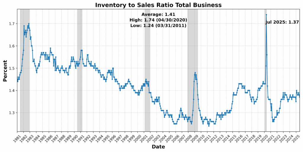 In July 2025, the three Business Conditions indicators are at a very different balance than they were one year prior. The Leading Index eased slightly but remains close to its strongest levels in well over twelve months. Markets and credit conditions continue to provide support, housing activity firmed, and jobless claims remained relatively low, suggesting some forward momentum. Still, the consumer mood is subdued and freight demand is soft, reflecting lingering caution after the “Liberation Day” tariff shock in April. The result is a forward picture that looks sturdier than it felt in the spring, but with confidence still tenuous.