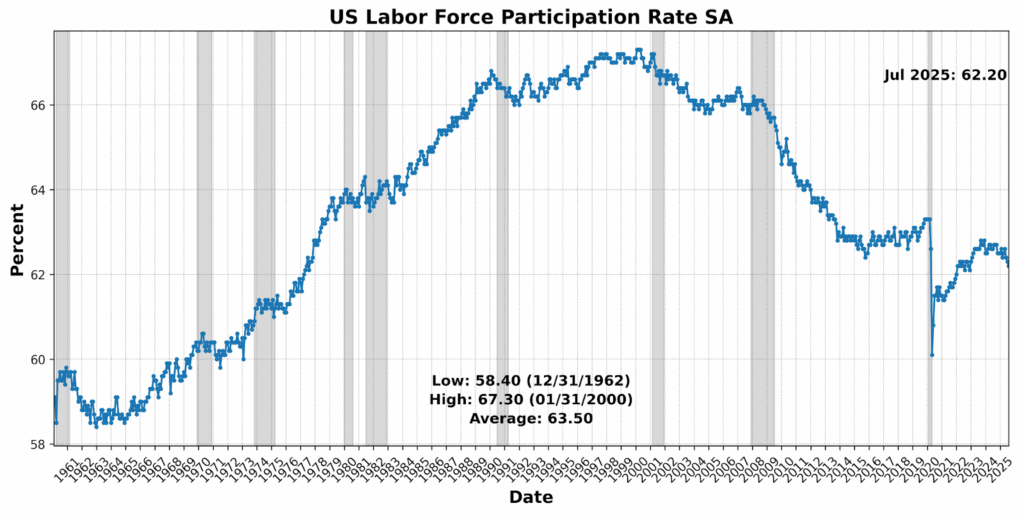 The Roughly Coincident Indicator rose from 21 to 50, marking a pause after June’s sharp contraction. Stability at this level reflects an offsetting mix of modest gains in sales, income, and payrolls against declines in production, participation, and sentiment — leaving the real-time picture flat but fragile.