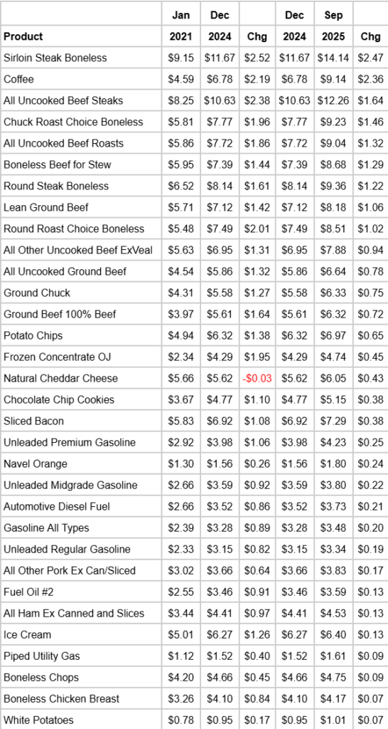 The same pattern holds in individual food categories. Sirloin steak, coffee, beef cuts, and many packaged goods are all measurably higher now than in January 2025. A few categories have fallen from recent peaks, but not enough to reverse the cumulative increases since 2021. In fact, several items rose more in the first nine months of 2025 than during the entire 2021 to 2024 period. This suggests not only that elevated prices remain embedded in household budgets, but that some categories continue to accelerate even after “high inflation” has supposedly ended. Put plainly, the affordability crisis that began in 2021 has not faded; it has evolved into a stubborn, category-specific price pressure affecting everyday goods.