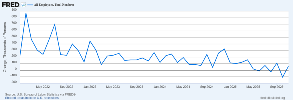 Figure 3: US Nonfarm Jobs, Monthly Change, Jan. 2022 to Nov. 2025