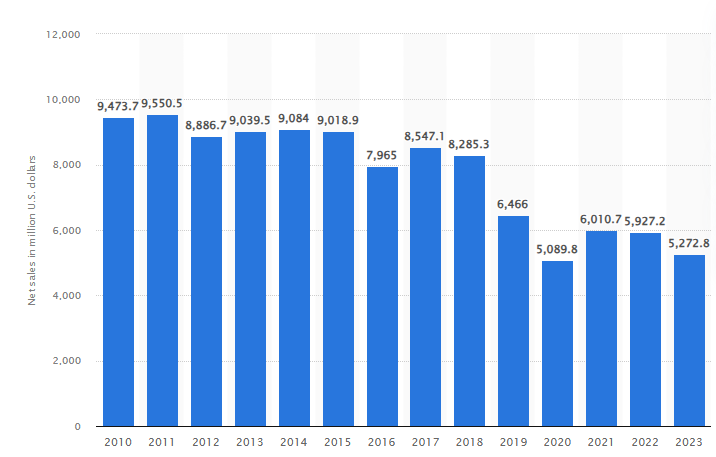 Net sales of GameStop worldwide from fiscal 2010 to fiscal 2023(in million US dollars)