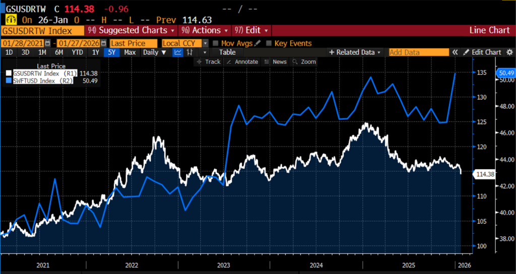Real Trade-Weighted US Dollar and USD percent in SWIFT, Jan 2021 – present