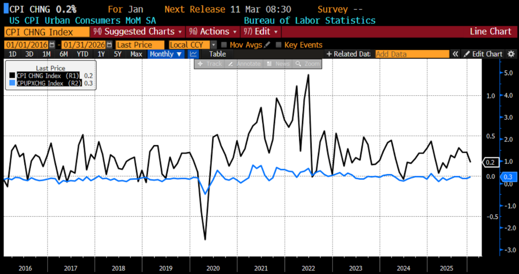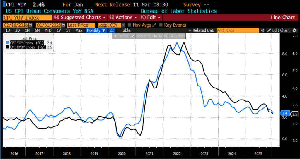 Over the prior 12 months, the headline Consumer Price Indices rose 2.4 percent against an expected 2.5 percent, with core year-over-year rising an expected 2.5 percent from January 2025 to January 2026.