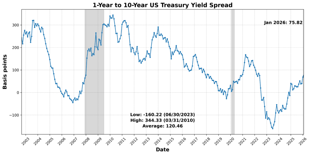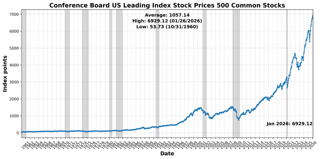 Gains were led by market-sensitive and forward-looking components. The University of Michigan Consumer Expectations Index rose 7.1 percent, while the Conference Board US Leading Index Stock Prices 500 Common Stocks increased 1.7 percent. The Conference Board US Manufacturers New Orders Nondefense Capital Goods Ex Aircraft advanced 0.5 percent, and US New Privately Owned Housing Units Started by Structure Total SAAR climbed 4.8 percent. United States Heavy Truck Sales SAAR surged 16.7 percent, and Debit Balances rose 0.9 percent. Labor-market forward conditions improved as US Initial Jobless Claims SA declined 6.0 percent (a positive after inversion). Offsetting these gains, the Inventory-to-Sales Ratio Total Business fell 0.7 percent, US Average Weekly Hours All Employees Manufacturing SA declined 0.2 percent, and the Conference Board US Leading Index Manufacturers’ New Orders Consumer Goods and Materials slipped 0.3 percent. The 1-to-10 Year Treasury Yield Spread widened sharply by 70.2 percent but was scored negatively given its inversion. Adjusted Retail and Food Services Sales Total SA was effectively unchanged. Overall, the leading profile reflects strength in expectations, housing, and financial conditions, partially offset by softness in production-related metrics and the yield curve signal.