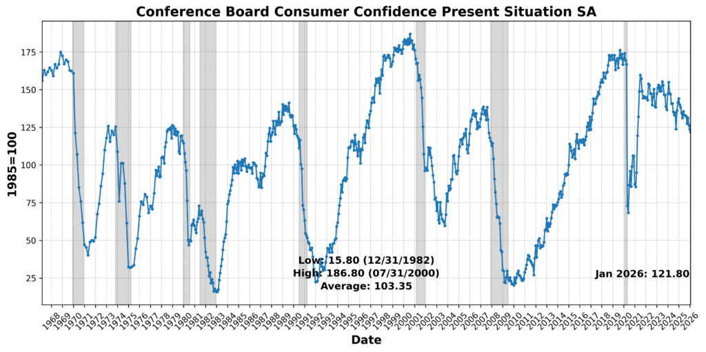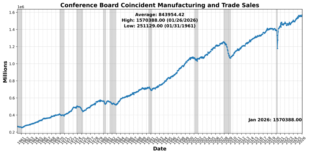 On the positive side, Conference Board Coincident Manufacturing and Trade Sales increased 0.8 percent, and US Industrial Production rose 0.3 percent. However, Conference Board Coincident Personal Income Less Transfer Payments declined 0.2 percent, and Conference Board Consumer Confidence Present Situation SA fell 2.1 percent. US Labor Force Participation Rate edged down 0.2 percent, while US Employees on Nonfarm Payrolls Total SA was essentially flat. The balance of evidence suggests modest activity in production and sales, but weakening income growth, participation, and sentiment are weighing on current conditions.