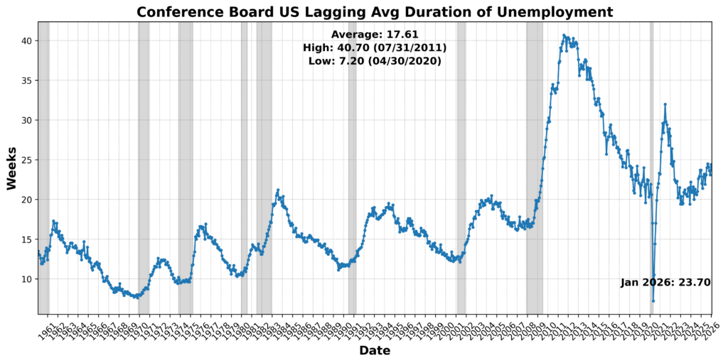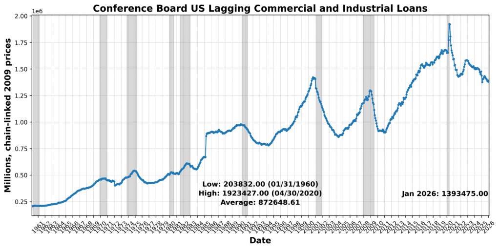 US CPI Urban Consumers Less Food and Energy Year over Year NSA rose 0.2 percent, and US Manufacturing and Trade Inventories Total SA increased 0.1 percent. In contrast, US Commercial Paper Placed Top 30 Day Yield declined 5.3 percent, Conference Board US Lagging Commercial and Industrial Loans fell 0.7 percent, and Census Bureau US Private Construction Spending Nonresidential NSA dropped 0.7 percent. The Conference Board US Lagging Average Duration of Unemployment rose 5.6 percent and was scored negatively after inversion. Taken together, the lagging profile points to persistent inflation alongside softening credit conditions, declining construction activity, and lengthening unemployment duration — signals consistent with a cooling economic backdrop.